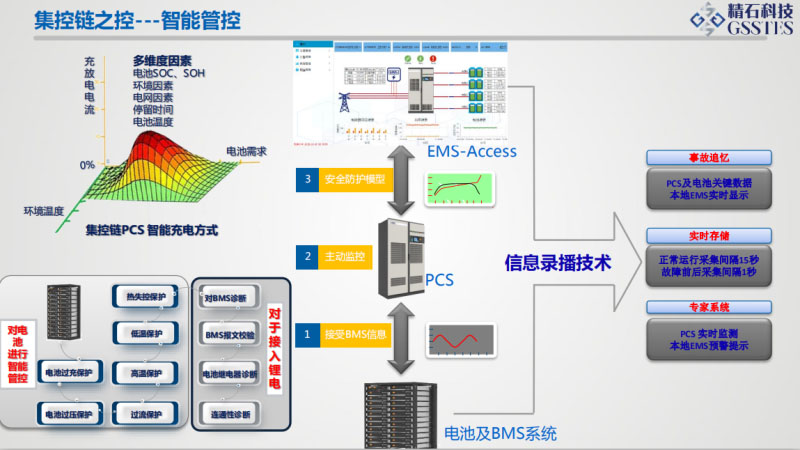 所謂的控是指智能管控,我們內(nèi)部集成的EMS我們稱(chēng)為Access,正常的系統(tǒng)保護(hù)基本上都是受BMS的調(diào)動(dòng),PCS僅僅是聽(tīng)從BMS的調(diào)度,我們?cè)赑CS、BMS的防護(hù)之外增加了一個(gè)智能管控功能,獨(dú)有的智能管控功能貫穿于整個(gè)系統(tǒng)得寵放電過(guò)程,當(dāng)BMS保護(hù)失效的時(shí)候它也能夠保障一個(gè)儲(chǔ)能系統(tǒng)的安全、一個(gè)可靠,比如說(shuō)電池過(guò)壓、過(guò)充、過(guò)溫以及它的BMS故障、BMS上傳數(shù)據(jù)不濟(jì)事或者更新不濟(jì)事等等一系列問(wèn)題。