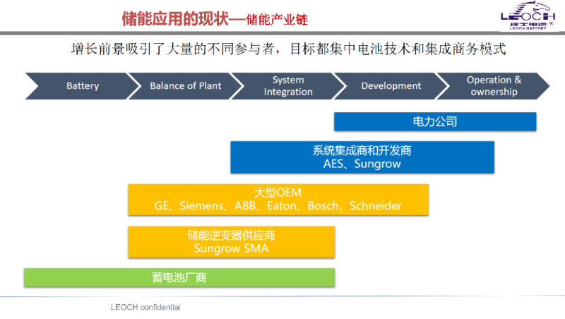 隨著全球的能源枯竭以及環(huán)境問題越來越嚴重,全世界各地的政府及研究機關(guān)都把很大的精力投入到儲能這方面應(yīng)用上面來。比如在美國、在澳洲及在歐洲一些國家政府都在大力推廣儲能業(yè)務(wù)的開展。儲能在中國的發(fā)展?fàn)顟B(tài)基本上是2000-2010年在技術(shù)驗證。2011-2015年是示范應(yīng)用階段。2016-2020年,我們預(yù)測,儲能市場的發(fā)展會逐步從示范應(yīng)用過渡到商業(yè)化的初期。我剛才說了,儲能業(yè)務(wù)的方興未艾,吸引了大量的不同的參與者。目標(biāo)主要集中在電池技術(shù)和集成商業(yè)模式方面的應(yīng)用。