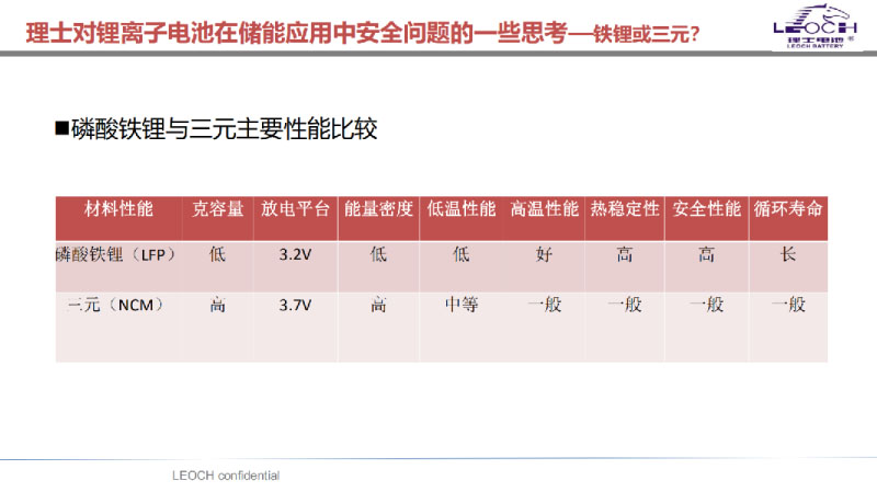 下面主要進行一下磷酸鐵鋰材料和三元材料主要性能的比較。大家知道,用在儲能方面的電池要求長壽命、高安全性以及低成本。磷酸鐵鋰能量密度雖然比較低。但是它的高溫性能好,最重要的是熱穩(wěn)定性好也就是安全性能好,壽命比較長,而且目前相對來說它的成本比三元低。從三元材料來講,它的克容量高,放電平臺高,也就是說能量密度高。它的低溫性能較好,高溫性能一般,熱穩(wěn)定性一般,安全性能也一般。從整體來看,從儲能要求的高安全性、長壽命,成本低來看,磷酸鐵鋰確實是儲能方面最佳的材料選擇。但是,我覺得三元的高能量密度,比較好的低溫性能,我覺得三元材料在未來也不一定非得排除在中國的儲能領(lǐng)域方面的應(yīng)用。隨著三元材料一些性能指標(biāo)逐漸提高并趕上磷酸鐵鋰。三元材料在不久的將來可能會出現(xiàn)在中國的儲能市場。這個問題,希望大家回去可以思考思考。我只是說說我個人的觀點。