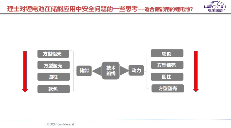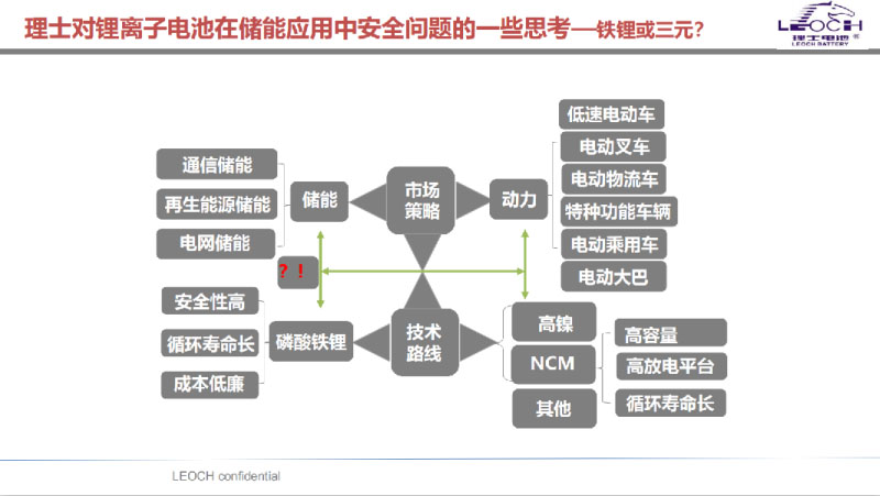 前面我所講的不是我今天演講的重點,我重點要跟大家討論的是儲能應(yīng)用中鋰離子電池應(yīng)用和安全問題。當(dāng)然這些問題有的爭論性很大,有的問題很尖銳。但是我希望我今天說出一些觀點,說出我們的想法,能起到拋磚引玉的作用。使大家對儲能應(yīng)用的安全問題更加重視。這個圖大概是一個鋰離子電池在所有領(lǐng)域方面的應(yīng)用。其實按照能源互聯(lián)網(wǎng)來劃分,這都是儲能應(yīng)用,各種電動汽車電池、通訊基站的后備電源,再生能源電網(wǎng)儲能,大的方面都叫儲能。但是今天我為了更好地說明問題,我把這些應(yīng)用分得更細一些。一個是動力鋰離子電池的應(yīng)用,包括低速車、物流車、乘用車及電動大巴的應(yīng)用,另外一個方面就是下面我們重點討論的儲能應(yīng)用。在儲能方面的應(yīng)用中,我的第一個問題,電池的選擇是磷酸鐵鋰還是三元?國內(nèi)目前是不允許三元材料用在儲能中的。那么的三元材料能不能用在這一塊領(lǐng)域當(dāng)中呢?