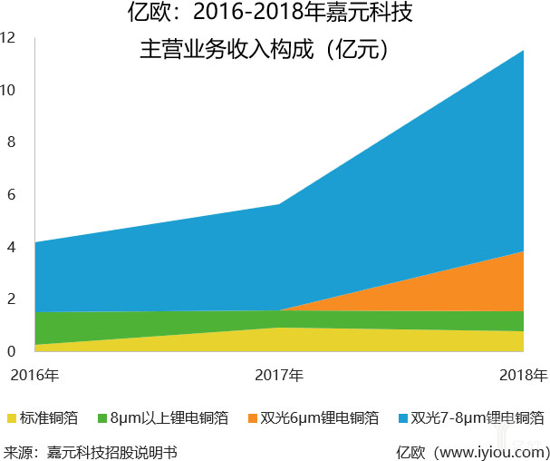 嘉元科技成立于2001年,是一家從事各類高性能電解銅箔研究、生產(chǎn)和銷售的高新技術(shù)企業(yè)。2016-2018年公司主營產(chǎn)品為雙光7-8μm鋰電銅箔,其營收占比超過60%。近兩年來6μm高性能極薄鋰電銅箔帶來的收入出現(xiàn)明顯增長,2017年營收3.76萬元,2018年則攀升至2.26億元,在主營業(yè)務(wù)收入中占比接近20%。公司也已研發(fā)出4.5μm和5μm極薄銅箔,其中4.5μm銅箔目前可實現(xiàn)小批量生產(chǎn),未來將成為公司核心產(chǎn)品。