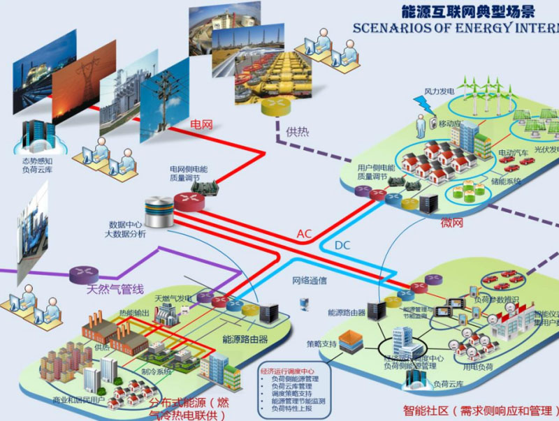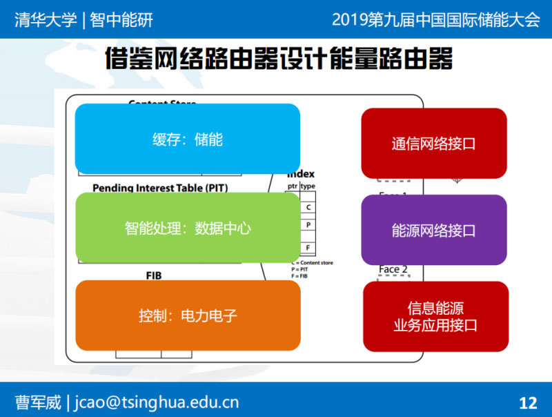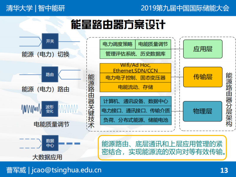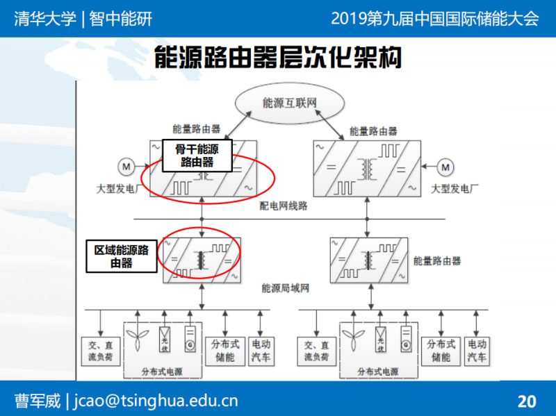 曹軍威:非常高興有機會在這里和大家分享。能源路由器的概念是從能源互聯(lián)網(wǎng)的概念延伸出來的。我們前幾年做了類似的裝置和示范工程,跟大家簡單匯報一下。背景不再多說了,上午專家已經(jīng)說了。能源互聯(lián)網(wǎng)希望像互聯(lián)網(wǎng)一樣自下而上:下有綜合性的園區(qū),上有國家電網(wǎng)的全球能源互聯(lián)網(wǎng),自下而上構(gòu)建能源基礎(chǔ)設(shè)施。從互聯(lián)網(wǎng)的概念類比過來,是不是有可能有類似這種局部的能量層面上的交換和路由裝置。這就是路由器和互聯(lián)網(wǎng)的基本提法?,F(xiàn)在已經(jīng)成為趨勢,之前做學術(shù)研究的時候,2011年能源互聯(lián)網(wǎng)可能只是一個概念,現(xiàn)在大家把能源互聯(lián)網(wǎng)具體形式如綜合能源服務(wù)作為一個主流趨勢,包括儲能這樣一些具體的環(huán)節(jié),也在大發(fā)展過程中。不詳細講了。
