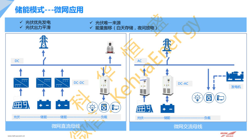這是我們?cè)陔x網(wǎng)這一塊的內(nèi)容。另外談到微網(wǎng)應(yīng)用,其實(shí)在微網(wǎng)應(yīng)用有兩種模式,一種是DC方案,一種是AC方案。各有優(yōu)勢(shì)和劣勢(shì)。比如說交流方案,從直流方案來(lái)看,它的好處是直流相比來(lái)說接入點(diǎn)不一樣。它接入的直流是有一個(gè)電壓,正負(fù)極的區(qū)別。但是交流不一樣。從整個(gè)的結(jié)構(gòu)來(lái)看,直流又存在另外一個(gè)問題。因?yàn)橹绷鞯谋Wo(hù),本身技術(shù)沒有零點(diǎn),保護(hù)措施是有差異的。第二個(gè)問題在于大、微電網(wǎng)。微電網(wǎng)和大電網(wǎng)的區(qū)別就是小跟大的區(qū)別。小的情況下,可以看一下這邊做的微電網(wǎng),核心點(diǎn)全部是電力電子器件,沒有所謂的發(fā)電機(jī)。這種情況下我們都知道,電力電子產(chǎn)品的特性完全不一樣。做電力穩(wěn)定的時(shí)候,考慮的不光是靠EMS可以搞定的,是靠器件的本身。直流有一個(gè)好處,其實(shí)像電池是不需要轉(zhuǎn)換的。這個(gè)時(shí)候你的尺寸就會(huì)做得很大。但是還有缺陷。缺陷在于我們直流這一塊的保護(hù)傳輸。相比交流的傳輸是有一定瓶頸的。