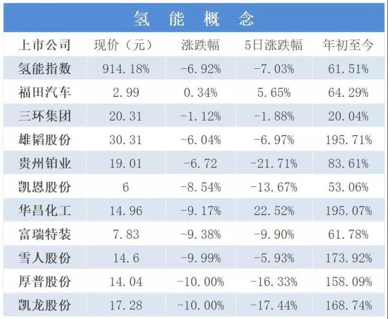 氫能產(chǎn)業(yè)如此火熱,但是這種火熱是否可持續(xù)呢?俗話說春江水暖鴨先知,股市是經(jīng)濟的晴雨表,同時也可以直接反應一個行業(yè)的市場情況。截至4月25日,氫能指數(shù)整體下跌6.92%,燃料電池指數(shù)整體下跌7.49%,具體相關(guān)概念上市公司情況如下: