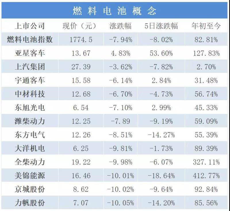 燃料電池方面,從年初至今的變化上看,同氫能概念大致相同,燃料電池指數(shù)和相關(guān)上市公司整體上漲,通過從最近一個周的周期上看,除亞星客車漲跌幅4.83%呈正數(shù)外,其余上市公司漲跌幅均為負數(shù),而且一半以上漲跌幅接近甚至超過了-10%,燃料電池指數(shù)在5日內(nèi)的漲跌幅為-8.02%。