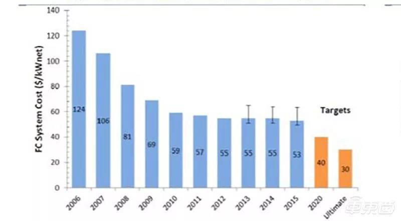 2018年,我國燃料電池的實際生產(chǎn)成本約為740美元/kW,以功率為50kW的燃料電池來算,一套電池成本高達25萬元,而要達到國外常用的80kW功率,一套電池成本接近40萬元。