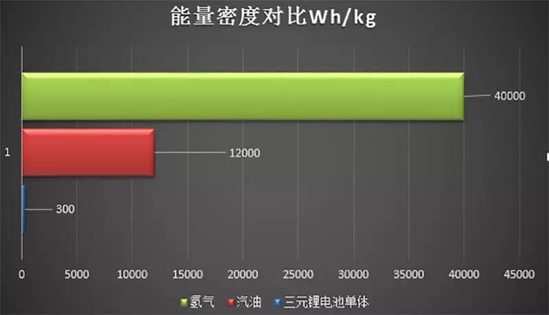 若要更直觀地理解這個數(shù)據(jù),可以換算成電動車里常用的Wh/kg能量密度單位。高能量密度的三元鋰電池電芯單體約為300Wh/kg,汽油約為12000Wh/kg,而氫氣達到了40000Wh/kg,是汽油的3.3倍、三元鋰電池單體的133倍。