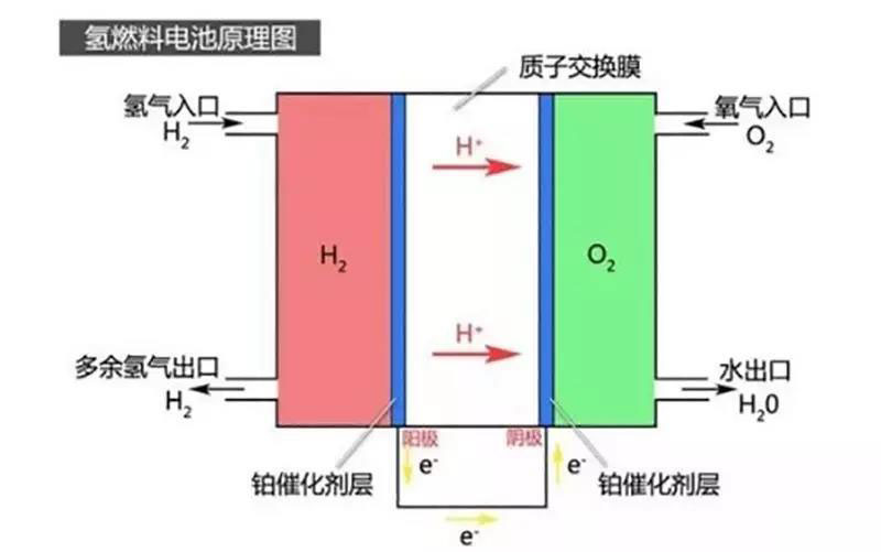 質(zhì)子交換膜的兩側(cè)是鉑(Pt)催化劑,氫氣通到陽極板后,在鉑催化劑的作用下,失去電子變成質(zhì)子,再通過質(zhì)子交換膜與另一側(cè)的氧原子結(jié)合生產(chǎn)水。
