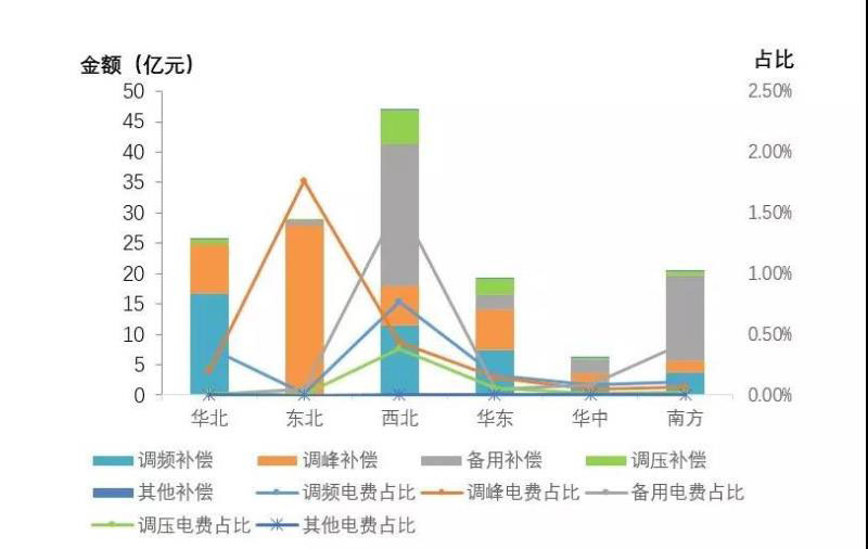 從分項(xiàng)電力輔助服務(wù)補(bǔ)償費(fèi)用來看,調(diào)峰、調(diào)頻和備用補(bǔ)償費(fèi)用占總補(bǔ)償費(fèi)用的90%以上。其中,東北、西北區(qū)域調(diào)峰補(bǔ)償力度最大,西北、華北區(qū)域調(diào)頻補(bǔ)償力度最大,西北、南方區(qū)域備用補(bǔ)償力度最大??傮w來看,西北區(qū)域整體電力輔助服務(wù)補(bǔ)償力度最大(見圖3)。
