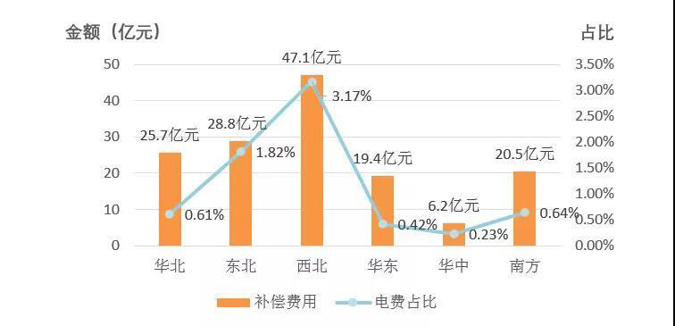 從電力輔助服務(wù)補(bǔ)償總費(fèi)用來看,補(bǔ)償費(fèi)用最高的三個(gè)區(qū)域依次為西北、東北和華北區(qū)域,西北區(qū)域電力輔助服務(wù)補(bǔ)償費(fèi)用占上網(wǎng)電費(fèi)總額比重最高,為3.17%,華中區(qū)域占比最低,為0.23%(見圖1)。