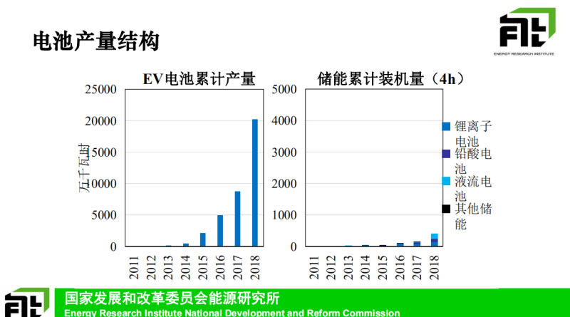 再來看一下就是電池產(chǎn)量的結(jié)構(gòu),這個(gè)圖其實(shí)想說明一個(gè)問題就是實(shí)際上目前這個(gè)電動(dòng)化儲能更大一部分來自電動(dòng)汽車,總的累計(jì)的電池的產(chǎn)量的一個(gè)統(tǒng)計(jì),到2018年,總的這個(gè)電動(dòng)汽車的動(dòng)力電池它的累計(jì)的產(chǎn)量已經(jīng)大約達(dá)到2億千瓦時(shí)這個(gè)規(guī)模,這個(gè)就是固定式儲能的統(tǒng)計(jì),除了鋰離子電池之外也涵蓋了一些其他的典型的電池,包括鉛酸這些的,總的裝機(jī)規(guī)模大約是1G瓦,也就是四百萬千瓦時(shí)這樣的規(guī)模。所以相比于這個(gè)動(dòng)力電池的市場規(guī)模來講的話是非常小的,大約也就是2%的這樣的規(guī)模??傮w來講的話,電動(dòng)汽車這樣的數(shù)量規(guī)模推動(dòng)了整體電池成本下降,如果電動(dòng)汽車本身作為一個(gè)儲能的單元,來參與到整體的這個(gè)電力系統(tǒng)儲能來講的話,它會產(chǎn)生非常重要的戰(zhàn)略的價(jià)值,比如說我們這個(gè)圖里面把這個(gè)電動(dòng)汽車和可再生能源之間進(jìn)行了一個(gè)聯(lián)系,可以幫助我們上游吸納更多的可再生能源,反過來新能源越來越多之后,里面有更多的新能源占比,可以解決目前電動(dòng)汽車的爭議,中國大量還是媒電,排放水平是逐步的降低??傮w來講他們之間的協(xié)作,通過儲能這種方式產(chǎn)生這樣的互動(dòng)協(xié)作可以解決各自在發(fā)展過程當(dāng)中面臨的關(guān)鍵的問題。