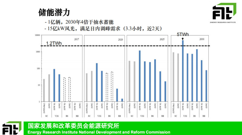 我們這里大致看一下就是電動(dòng)汽車與電網(wǎng)互動(dòng)的幾種典型的模式,電池更換還有這個(gè)第一類稍微有點(diǎn)不同,是一個(gè)單向的通過調(diào)節(jié)充電時(shí)間,去實(shí)現(xiàn)虛擬儲能的作用,后面幾種是電動(dòng)汽車跟電網(wǎng)雙向驅(qū)動(dòng)的模式,這個(gè)大家比較了解,不具體說了,這也是我們可能兩年前做的一個(gè)研究的,就是假設(shè)2030年有一億輛電動(dòng)汽車的規(guī)模,來評估幾種儲能方式,總的儲能的這樣能力。通過V2G這樣來講的話,可以提供5T瓦時(shí)的儲能能力這樣的規(guī)模的話差不多就是4倍這樣的規(guī)模,按照8小時(shí)的放電時(shí)間,1.5億千瓦的這種資源去評估的。