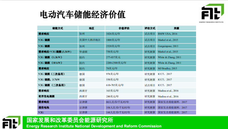 剛剛說的是一個(gè)技術(shù)潛力這個(gè)問題,再看一下電動(dòng)汽車儲能的經(jīng)濟(jì)的這個(gè)問題,這個(gè)國外研究比較多,收集了相關(guān)的一些研究成果,上面幾類在德國美國歐洲的一些國家,他們所做的案例的研究,有部分試點(diǎn)項(xiàng)目,有一部分就是研究的一個(gè)結(jié)果,總的來講的話,我們看到如果電動(dòng)汽車可以去參與一些比如說像調(diào)頻這種服務(wù)的話,它其實(shí)產(chǎn)生的這樣的價(jià)值還是非常高的,差不多每年可以超過兩千,就是比較高的情況下可以超過兩千美元。國內(nèi)也有一些案例研究,總的來講的話就是如果我們最后的歸類來講的話,電動(dòng)汽車可以實(shí)現(xiàn)跟電網(wǎng)更多的分離,比如說可以把電池跟車運(yùn)行可以結(jié)合的話,它的價(jià)值會更高一些,如果使用車載電池的話,V2G相對來說更低一些,采用這種單向的調(diào)節(jié)的話,它的價(jià)值可能又會更低一些,總體來講的話這樣的規(guī)律,高中低這樣的價(jià)值的排列,跟國外的情況也有比較相似的地方。