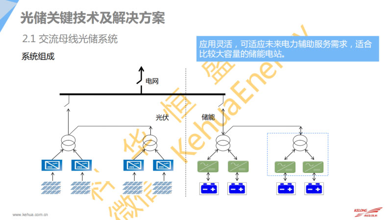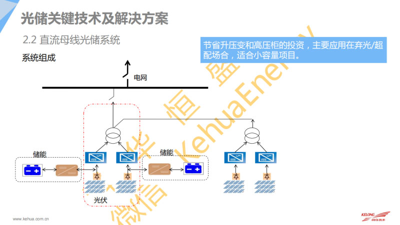 第二部分其實(shí)大家看這個(gè)也是會(huì)比較簡(jiǎn)單,就是直流母線,它的應(yīng)用特點(diǎn)可以看到儲(chǔ)能跟光伏是通過(guò)直流的一個(gè)偶合,然后并到我們的電網(wǎng),那這種的話,它的特點(diǎn)就是可以跟前面的交流母線省掉了變壓器跟相關(guān)的,但是這種應(yīng)用的話也有一些限制,每個(gè)直流端不去配對(duì)應(yīng)的儲(chǔ)能會(huì)比較分散的,這種也有應(yīng)用的需求,成本比較低。