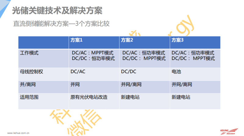 那第四部分是對(duì)科華在光儲(chǔ)產(chǎn)品還有方案上面的簡(jiǎn)單的介紹,解決方案里面有一個(gè)服務(wù),包括離網(wǎng)微網(wǎng)服務(wù)以及大型的電站跟分布式的發(fā)電應(yīng)用,離網(wǎng)的解決方案涉及到雙向的控制器還有低壓的384V的控制器,包括對(duì)應(yīng)的逆變器,從10-600K的功率,針對(duì)離網(wǎng)的。上面是并網(wǎng)跟離并網(wǎng)都可以的PCS跟雙向的也都已經(jīng)在現(xiàn)場(chǎng)適用了。防逆流控制器、EMS能量管理系統(tǒng),這是相關(guān)的配套產(chǎn)品。這個(gè)從1000V到1500V的電壓等級(jí),功率的話覆蓋500-1700kW ,集裝箱式的話1兆瓦到1.7兆瓦的。包括對(duì)應(yīng)的話那個(gè)是1000V跟1500V的控制器。