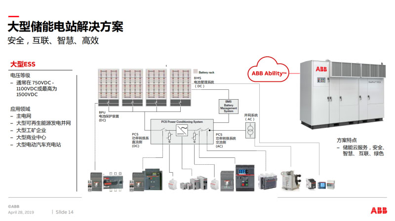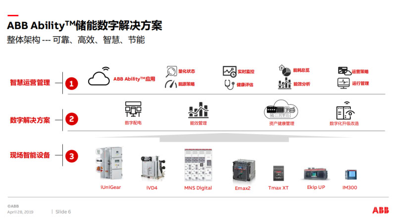 這是ABB電氣事業(yè)部在儲能行業(yè)的一些主要的應用方案,第一個方案是儲能數(shù)字化解決方案,還有四個方案,大型儲能電站方案,小型儲能電站方案,儲能電能質(zhì)量解決方案,儲能防雷接地方案,總共有五個解決方案。這是在儲能電站的一個整體方案構架,在現(xiàn)場主要是各種智慧設備和智能傳感器,這里主要列舉了iUniGear、、iVD4、MNS Digital、Emax2、Tmax XT、Ekip Up、EM300等。我們在數(shù)字配電、能效管理,還有就是整個儲能電站的資產(chǎn)管理管理,以前舊的或者現(xiàn)在新建的儲能電站有數(shù)字化升級需求的。第三部分就是運用層,在ABB Ability系統(tǒng)里開發(fā)的各種儲能應用。