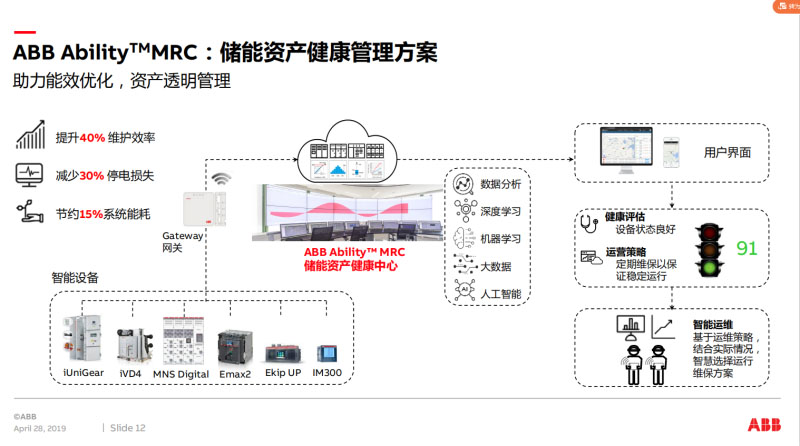 ABB儲能數(shù)字配電方案,可以應用在儲能電站PCS的直流側與交流側,在并網(wǎng)側有中低壓數(shù)字配電解決方案。我們看一下iUnigear中壓數(shù)字配電解決方案,是ABB的原裝柜,在對中壓真空斷路器的特性監(jiān)測包括它的合分閘線圈和電機儲能,柜體關鍵點的溫升監(jiān)控,程序化的控制,我們的底盤車也可以實現(xiàn)電動操作,而且可以在柜體加裝視頻監(jiān)控設備,可以實現(xiàn)看得見的安全。通過數(shù)據(jù)采集監(jiān)測,運用儲能大數(shù)據(jù)和云平臺,可以對iUnigear進行綜合評估,包括溫升評估、機械特性評估和綜合能耗分析, ABB是電力和自動化技術的一百多年的老字號,可以為儲能電站進行科學建模,還有全球?qū)嶋H項目的工程經(jīng)驗,能耗的優(yōu)化管理,日常的運維,還有自動程序的控制,給出一些儲能電站定制化的運維建議,可以通過專業(yè)人員的智能移動終端實現(xiàn)隨時隨地的移動控制。