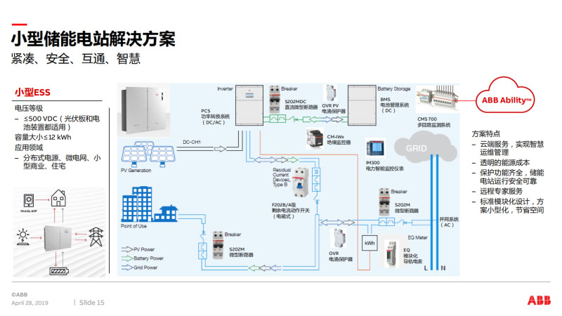 中壓真空斷路器一般沒有什么保護功能,ABB在高安全可靠的VD4中植入了一些數(shù)字化技術,iVD4在開關觸臂中嵌入了無線傳輸?shù)臏囟缺O(jiān)測傳感器,還有對合分線圈和電動儲能的監(jiān)測,電動的底盤車,柜體內(nèi)部可視化。通過MDC4可以連接到ABB Ability云平臺,通過這些數(shù)據(jù)分析診斷,還有可以像社交網(wǎng)絡那樣非常簡單地推送有關信息。MNS digital低壓數(shù)字化開關柜也是ABB的原裝柜,MNS digital數(shù)字化技術主要體現(xiàn)在柜體溫升監(jiān)測,在抽屜里面做了一個一體化的溫升監(jiān)控模塊,饋電和電動機回路有一個管理模塊,模塊可以按需擴展,通信采用環(huán)路結構實現(xiàn)冗余系統(tǒng),保證通信更加安全可靠,通信速度更快,是傳統(tǒng)通信網(wǎng)絡的數(shù)百倍,超大的傳輸數(shù)據(jù)量,可對開關柜運行狀態(tài)進行大數(shù)據(jù)分析。可以通過智能移動終端下載APP進行參數(shù)在線設置,可以與其它智能控制系統(tǒng)連接,也可以通過ABB Ability上我們的配電云平臺。4月17日在杭州紹興參加2019中國自動化產(chǎn)業(yè)年會, ABB EDCS獲得了年度最具價值解決方案獎,實現(xiàn)“配電室入口袋”,通過智能移動終端可以了解和掌控你的整個儲能系統(tǒng)。Ekip COM HUB可以植入到Emax2,脫扣器要配液晶屏的那種,Emax2要配置通信模塊,Ekip Up是用于儲能數(shù)字化升級改造的,這個也要帶通信口。Emax需配置通信模塊和電壓模塊,Tmax也是要帶通訊模塊,并且要配電子式脫扣器。S200通過配置CMS700可以上配電云平臺??蛻魧δ茈娬救芷诘馁Y產(chǎn)管理也有一定的需求,ABB MRC儲能資產(chǎn)健康管理方案,通過智能化的現(xiàn)場設備和各類傳感器,ABB MRC資產(chǎn)健康管理中心已建立各種數(shù)據(jù)模型,對監(jiān)測數(shù)據(jù)進行深度分析,結合大數(shù)據(jù),進行自主學習,可以實現(xiàn)儲能資產(chǎn)智慧管理。Ekip UP是儲能數(shù)字化升級方案,如果是現(xiàn)在建設的或者以前老的儲能設備,我們怎樣升級,有Ekip Up就非常簡單,不占空間,不用淘汰老設備,并且可以兼容第三方設備。這是大型儲能電站解決方案,ABB北京一家工廠可以生產(chǎn)整套的儲能設備,也可以由儲能設備生產(chǎn)商進行配套集成,在PCS直流側有直流專用Emax DC、Tmax DC、S200MDC,還有ABB光伏專用的電氣產(chǎn)品。這是小型儲能電站解決方案,核心配套電氣產(chǎn)品有S200、F200、CMS700、OVR等。在儲能電能質(zhì)量方面,ABB今年有新的產(chǎn)品,多功能模塊化PQactiF 有源濾波器和 PQflexC 混合補償用有源無功方案,模塊化設計,可以16 個模塊組合,允許混合使用,響應時間短,可選開環(huán)或閉環(huán)控制。在儲能電站防雷接地方面,ABB Furse綜合雷電防護解決方案具有優(yōu)良的導電性和熱穩(wěn)定性,耐腐蝕,使用壽命長,后續(xù)維護成本低,接地電阻低,熱熔焊方式,省時省力,無虛焊點,連接更可靠。