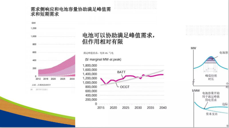 更多的資源怎么用呢?從這個發(fā)電系統(tǒng)運行層面,市場機(jī)制負(fù)荷靈活發(fā)電,這個電網(wǎng)儲能各個方面我們都認(rèn)為要發(fā)揮作用,但是我們也看一下這個成本,縱軸成本應(yīng)該說是目前為止我們要更多的利用低成本的一些技術(shù),包括一些標(biāo)準(zhǔn),市場設(shè)計,負(fù)荷響應(yīng),靈活性來提升?,F(xiàn)在這個火電的靈活性也在全面的推開,大范圍的電網(wǎng)互聯(lián)在增加,右側(cè)的儲能我們認(rèn)為現(xiàn)在儲熱簡單易行的,在北方地區(qū)供熱系統(tǒng)可能做了一些嘗試,增加一些儲熱能力,學(xué)習(xí)丹麥的經(jīng)驗。這個電站也是最主要的資源,化學(xué)儲能按照目前的這種是幾年前做的,按照目前這種成本是成本比較高的,隨著儲能技術(shù)下降,這個成本要往下降。更多的利用成本越來越高的一些技術(shù),儲電目前看來比較高的,隨著比重的增加儲能發(fā)揮著越來越多的作用。大部分儲能在協(xié)同發(fā)展?jié)摿Γ褡髠?cè)這個圖是可再生能源發(fā)電的比重,占到的絕大部分的比重,右側(cè)電動汽車是重要的一個將來儲能的潛力市場,分析到2050年的時候,全部的新興車都是這個電動化的汽車,當(dāng)然包括一些氫燃料汽車我們認(rèn)為要發(fā)揮作用的,未來這個潛力比較大的,我們做了相關(guān)的一些分析,這個圖應(yīng)該上面是發(fā)電側(cè),橙色部分是波動性的風(fēng)電加光伏。下面這個圖是需求側(cè)的,整合的負(fù)荷再加上我們這個電動汽車的靈活的一些智能的充電,我們看一下就是這些新能源電動汽車怎么協(xié)同的,發(fā)揮的機(jī)制是什么?是價格,供需還有價格。這個黑色的線就是價格,隨著這種電力供需供應(yīng)過剩白天的時候,太陽能幾十億甚至二十億千瓦的光伏出電的時候,動力供應(yīng)是充足的,甚至過剩的。那個時候價格是充電的,光伏下降的時候,供應(yīng)相對不足的,那個時候充電就是價格的充電時間要轉(zhuǎn)移的。