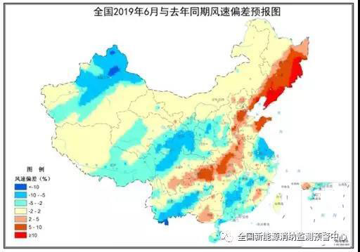 全國(guó)2019年4月(上圖)、5月(中圖)、6月(下圖)與去年同期風(fēng)速偏差預(yù)報(bào)圖(數(shù)據(jù)來(lái)源:中國(guó)氣象局風(fēng)能太陽(yáng)能資源中心)