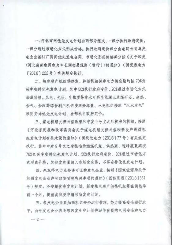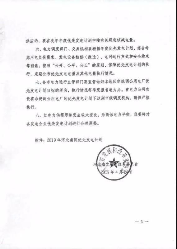中國儲能網(wǎng)訊:近日,河北發(fā)改委下發(fā)《關(guān)于下達2019年河北南網(wǎng)優(yōu)先發(fā)電計劃的通知》提出,風(fēng)電、光伏、生物質(zhì)等非水可再生能源以及煤矸石、余熱、余氣、余壓等綜合利用機組按照資源量、水電機組按照“以水定電”原則安排優(yōu)先發(fā)電計劃,全部執(zhí)行政府定價。