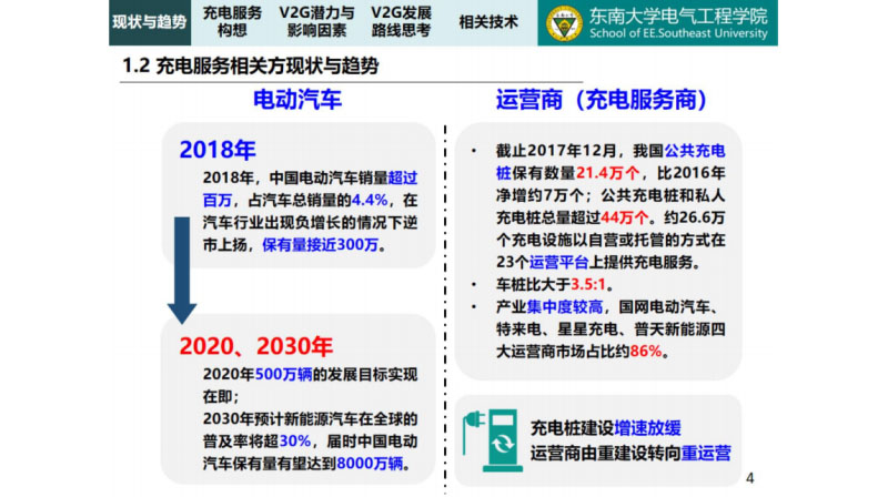 對(duì)于具體的相關(guān)方,對(duì)于用戶的發(fā)展很快,運(yùn)營(yíng)商前幾年發(fā)展也是很快的,這幾年的建設(shè)有點(diǎn)放緩,對(duì)于電網(wǎng)而言V2G有兩點(diǎn),第一個(gè)對(duì)于變壓器因?yàn)樘峁┻@個(gè)容量的,如果電動(dòng)汽車都在充電都講了,使得電網(wǎng)承受更大的壓力,這個(gè)我們都知道。另外一個(gè)變化就是關(guān)于新能源的接入,本身隨機(jī)性比較強(qiáng),接入以后對(duì)電網(wǎng)又提出了更高的要求,所以電動(dòng)汽車和新能源這兩者加入了電網(wǎng)以后,對(duì)這個(gè)電動(dòng)汽車的電網(wǎng)互動(dòng)提出了更高的要求。國(guó)網(wǎng)公司早就意識(shí)到這一點(diǎn),今年關(guān)于智慧能源服務(wù)平臺(tái)的應(yīng)用,電動(dòng)汽車有序充電,被列為國(guó)網(wǎng)2019年的重點(diǎn)任務(wù)。