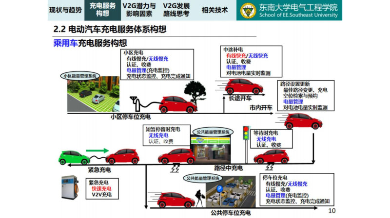 所以提出了這個(gè)規(guī)?;妱?dòng)汽車方案的思考,要滿足這幾大要求,對(duì)于私家車或者說(shuō)我們認(rèn)為對(duì)于乘用車的充電方案理想的充電方案應(yīng)該什么樣的,首先從小區(qū)里面開出來(lái),一般認(rèn)為應(yīng)該用有線慢充或者無(wú)線慢充,今天晚上停過(guò)去,明天早上開的時(shí)候這段時(shí)間,從小區(qū)里面出來(lái)以后,中間有一個(gè)要么在市內(nèi)開要么長(zhǎng)途開,有線快充,無(wú)線快充都可以,最主要還是市內(nèi)有一個(gè)等待的充電。比如說(shuō)開車碰到一個(gè)紅綠燈,一分鐘,在那個(gè)時(shí)間可不可以用更高一級(jí)的充電方式,比如說(shuō)無(wú)線充電,碰到一個(gè)紅綠燈停下來(lái)充,也做的一個(gè)行徑當(dāng)中的無(wú)線充電,一邊開一邊充,當(dāng)然這個(gè)屬于未來(lái)性質(zhì)的肯定還是以有線為主的。