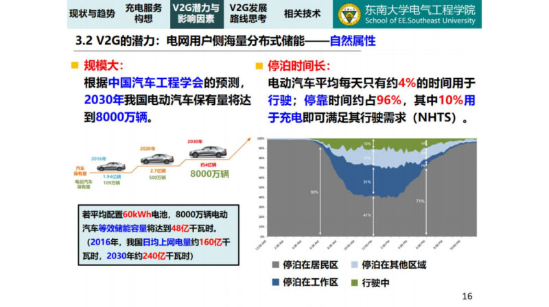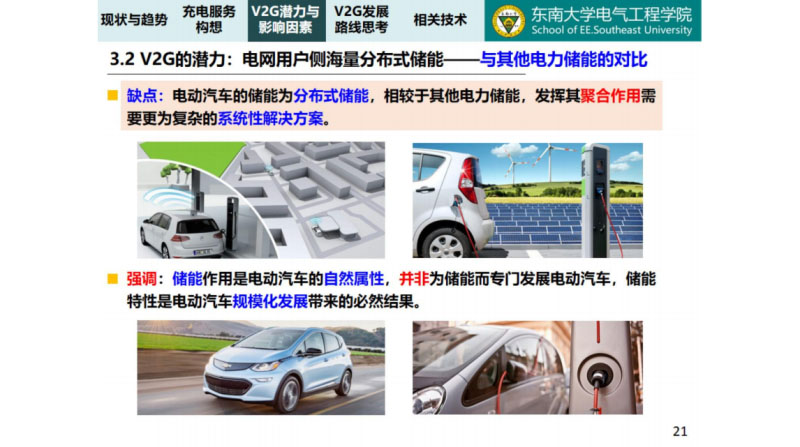 對(duì)于電動(dòng)汽車的儲(chǔ)能做了一個(gè)對(duì)比,電網(wǎng)用戶側(cè)的海量的分布式的儲(chǔ)能與其他的對(duì)比,它的功率比較大,能量也比較大,具有雙向的調(diào)節(jié)能力,因此它的優(yōu)點(diǎn)很明顯的,就是說(shuō)電動(dòng)汽車的這個(gè)儲(chǔ)能比較有優(yōu)勢(shì),這里還有一點(diǎn)就是要強(qiáng)調(diào)就是說(shuō)它的缺點(diǎn)也很明顯,V2G它的缺點(diǎn)很明顯,因?yàn)殡妱?dòng)汽車的儲(chǔ)能為分布式的儲(chǔ)能,發(fā)揮聚合作用,需要更為復(fù)雜的系統(tǒng)性的解決方案。一個(gè)很大的容量放在那里,電動(dòng)汽車千家萬(wàn)戶都在使用,你怎么發(fā)揮它的儲(chǔ)能作用,這也是很多人一直在想的,所以我們一直認(rèn)為前面講的解決方案,是一個(gè)系統(tǒng)性的解決方案,不可能說(shuō)哪一家提出來(lái)怎么樣,這是一個(gè)我們針對(duì)于這個(gè)電動(dòng)汽車V2G的一個(gè)思考。