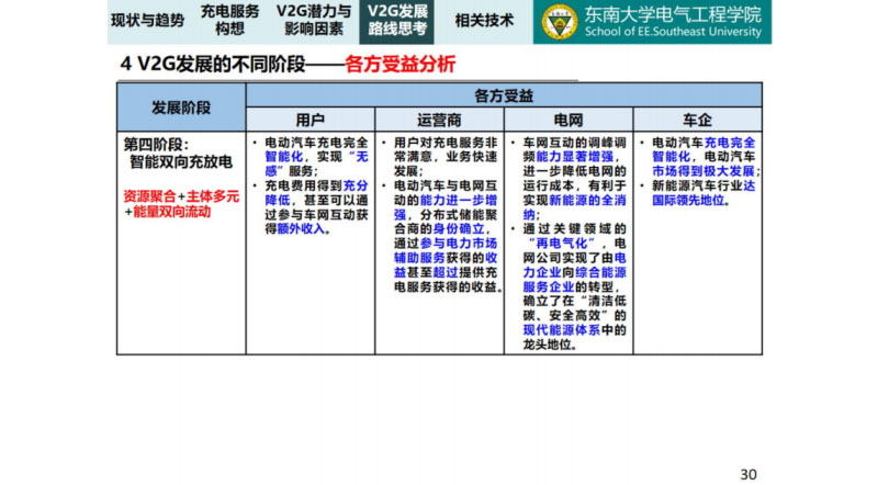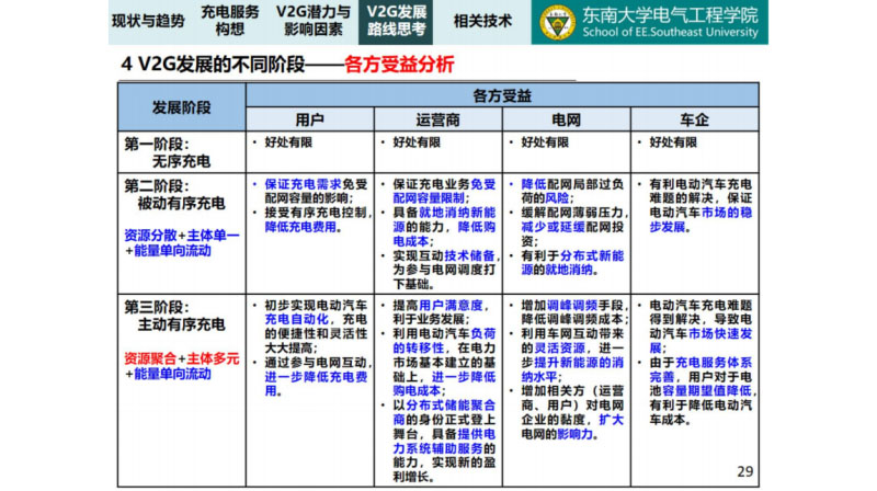這個(gè)時(shí)候就來(lái)分析各個(gè)階段可以拿到什么好處呢?第一階段無(wú)需充電,一插就充,不能拿到其他的收益,運(yùn)營(yíng)商就賣電,賣個(gè)服務(wù)費(fèi),電網(wǎng)就賣電給你,車企車就這么多,第一階段大家的好處都是有限的,V2G的推進(jìn)工作不是那么順利,因?yàn)榇蠹矣X得做了以后對(duì)我有什么好處呢?當(dāng)然各位專家從學(xué)校的角度考慮的,有什么得罪的你們不要介意,好處有限為什么要做這個(gè)事情。第二階段到被動(dòng)有序階段,用戶有一定的想法要趕快充電,因?yàn)槟莻€(gè)時(shí)候已經(jīng)限電了,要充電,有一定的好處,運(yùn)營(yíng)商可以保證充電業(yè)務(wù)避免受到配網(wǎng)容量的限制,可以降低購(gòu)電成本,有一定的積極性,對(duì)電網(wǎng)可以降低配網(wǎng)的局部風(fēng)險(xiǎn),可以減少或者延緩?fù)顿Y,有利于分布式能源的消納,有一定的積極性。車企有利于電動(dòng)汽車充電,充電問(wèn)題解決了,電動(dòng)汽車的發(fā)展就可以更快的發(fā)展,所以在第二階段被動(dòng)有序可以發(fā)現(xiàn)其實(shí)運(yùn)營(yíng)商和電網(wǎng)的積極性比較高的。這也是為什么我們?cè)诘诙A段做的時(shí)候,經(jīng)常電網(wǎng)推動(dòng)的,你不推動(dòng)這個(gè)充不了的。所以看第二階段,第三階段主動(dòng)有序階段,用戶參與電網(wǎng)調(diào)節(jié),它的費(fèi)用可以降低,運(yùn)營(yíng)商也可以得到好處,不僅電網(wǎng)在第二階段只是賣電,到了第三階段就是增加了它的調(diào)頻能力的就是更安全的我為什么不做呢?車企也更好的,在第三階段大家的好處都增加了,如果到了第三階段大家都有積極性,不再是電網(wǎng)主推的,當(dāng)然這一切就是電動(dòng)汽車規(guī)模化發(fā)展,只要你電動(dòng)汽車數(shù)量不增加,一切都是空的。