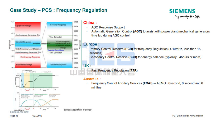這是過去一年半的項(xiàng)目。關(guān)于儲(chǔ)能方面,我們的PCS在能源方面的應(yīng)用。很多地方都有我們的項(xiàng)目。在澳大利亞有很多項(xiàng)目。有兩個(gè)事情關(guān)注,一個(gè)是調(diào)頻,調(diào)頻是很大的一個(gè)概念。每個(gè)地區(qū)都會(huì)覺得對(duì)這個(gè)調(diào)頻的要求是不一樣的。在中國本地的市場,我們看到客戶更多的是要求做AGC的支持,確保給電網(wǎng)提供更多的支持。這是電網(wǎng)運(yùn)營商的要求。在歐洲,歐洲不同的國家,也會(huì)有不同的調(diào)頻的要求。比如在德國會(huì)關(guān)注PCR的概念。還有英國,也會(huì)有PCR的要求或者SCR的要求。每個(gè)地區(qū)每個(gè)國家的想法是不一樣的。澳大利亞是一個(gè)比較開放的市場,是一個(gè)市場驅(qū)動(dòng)型的競爭。這是一個(gè)很廣泛的概念,取決于不同的國家。在大多數(shù)地方,對(duì)于響應(yīng)會(huì)有一些要求。比如一秒或者好幾秒。比如澳大利亞,從連接角度來說,希望有一個(gè)比較好的主控。