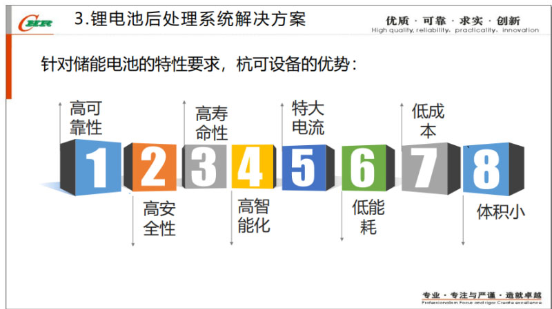 我們目前的鋰電池都是一些大電池的產品、大電流的產品、高功率的產品,所以對于它的能量消耗客戶是非常關注的,所以我們在充電和放電效率目前來講,充電效率能達到85%,放電效率回收的效率能控制在82%。為了更大的能夠讓客戶獲得產能的提升,我們在體積小型化方面做了很多的努力,能夠讓目前我們設備使用的體積降低75%,就是說空間利用率能夠更得到一個提高。