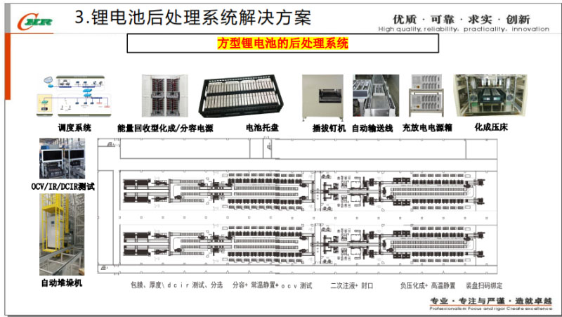 這個是目前杭可在主要幾個大類的電池產品當中提供的一些整體解決方案,我們現(xiàn)在看到的就是一個圓柱的鋰電池的后處理系統(tǒng),包含了物流系統(tǒng)、充放電系統(tǒng)以及一些自動化的設備,這個系統(tǒng)目前在國內的很多電池公司已經得到了應用。這是我們給客戶提供的一個系統(tǒng)解決方案,從這個上面我們可以看出,杭可是有實施經驗的一個項目。