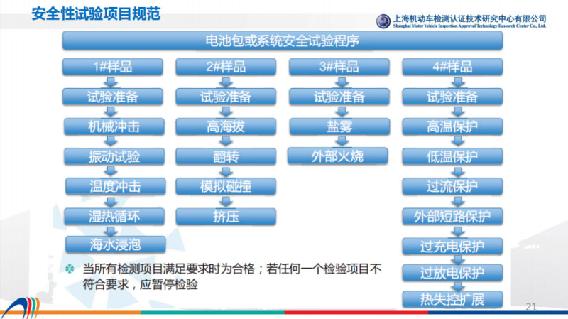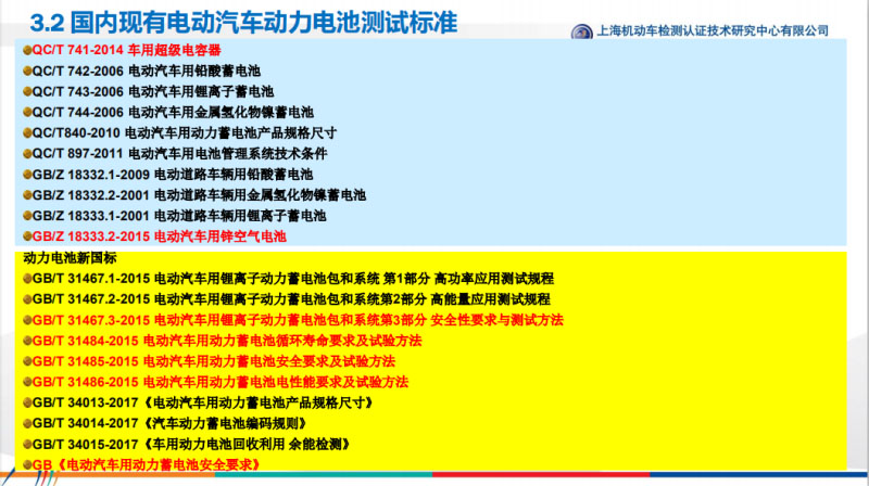 回到國內(nèi), 2015年以前,動(dòng)力電池相關(guān)的標(biāo)準(zhǔn)應(yīng)該是比較欠缺的,大家可能在這個(gè)行業(yè)比較熟悉的話,最早2015年電池公告實(shí)驗(yàn)是參考了汽車行業(yè)的行業(yè)標(biāo)準(zhǔn)QC/T 743,對(duì)前期有一定的幫助,如果從一個(gè)產(chǎn)品的全面測評(píng)來講還是有所欠缺的,但是隨著后面我們整個(gè)一系列的標(biāo)準(zhǔn)的發(fā)布,包括從GB/T 31467、31484、31485、31486,再到最近發(fā)布的可追溯體系到退下來回收體系等等相關(guān)標(biāo)準(zhǔn),還有最近提到的動(dòng)力電池安全國標(biāo),這些標(biāo)準(zhǔn)陸續(xù)出臺(tái)以后,對(duì)我們產(chǎn)品前端起到良好的作用。具體的31485,單體、模塊相關(guān)的安全性要求實(shí)驗(yàn)。31467.3,電池系統(tǒng)強(qiáng)制性實(shí)驗(yàn)要求,總共16項(xiàng)內(nèi)容。