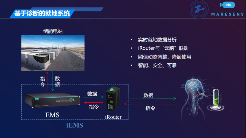 具體來(lái)說(shuō),我們的這個(gè)預(yù)防性診斷安全系統(tǒng)在華云科技在T02展臺(tái)上作為他們的供應(yīng)商展示,我們用“云腦+邊緣計(jì)算”實(shí)現(xiàn)這個(gè)功能,我們叫云原生邊緣計(jì)算,這里面很多計(jì)算放在邊緣上做,也就是說(shuō)我在邊緣是實(shí)時(shí)獲取數(shù)據(jù),然后把數(shù)據(jù)扔到云端,在云端通過(guò)對(duì)幾個(gè)關(guān)鍵的電子參數(shù)在單體層面看它的數(shù)據(jù)流、它的曲線,然后建模,預(yù)測(cè)它的曲線分布,確定它的閾值,根據(jù)變化曲線看閾值在哪里,一旦實(shí)時(shí)的監(jiān)測(cè)數(shù)據(jù)要是超出閾值馬上報(bào)警。這個(gè)閾值是放在這里,動(dòng)態(tài)的閾值,這個(gè)閾值是根據(jù)運(yùn)算以后動(dòng)態(tài)的更新,而這個(gè)閾值另外一方面是我們可以設(shè)定關(guān)鍵參數(shù)的閾值,還可以做另外一件事情,就是你用BMS控制你的充放電的時(shí)候有一個(gè)閾值。我們知道新電池閾值肯定是沒(méi)問(wèn)題的,老化了以后你還能用原來(lái)的閾值嗎?是不是可以更新一下。我們?cè)趺锤履??我們把這個(gè)閾值放在智能終端iRouter那里,為BMS、EMS提供按需更新的可能性。在基于就地iRouter的“云腦+邊緣計(jì)算”構(gòu)架里,EMS控制的儲(chǔ)能電站的監(jiān)測(cè)數(shù)據(jù)通過(guò)iRouter傳到云端,閾值動(dòng)態(tài)調(diào)整,定額使用,我們現(xiàn)在是iRouter和EMS互動(dòng),以后也許可以整合在一起,成為iEMS。