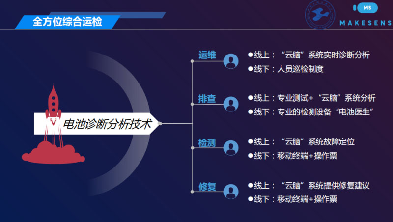 我們可以做到全方位綜合的運(yùn)檢。什么意思?運(yùn)維我們線上,線上有一個(gè)云腦系統(tǒng)實(shí)時(shí)診斷分析,線下人員巡檢、排查,線上專業(yè)的測(cè)試,加上云腦的系統(tǒng)分析,線下我們可以有專業(yè)的檢測(cè)設(shè)備,電池醫(yī)生。具體檢測(cè),線上云腦系統(tǒng)的故障定位,線下有操作票,告訴操作工人拿到這個(gè)操作票具體去哪里帶著移動(dòng)終端去做檢測(cè),線上的修復(fù)也是我們修復(fù)建議,告訴你應(yīng)該做什么,線下就拿來(lái)操作票,拿一個(gè)均衡儀去修復(fù)一下。