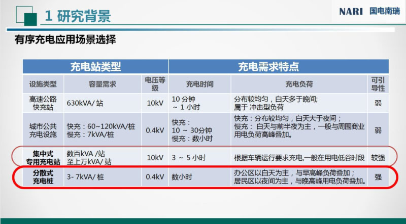 南瑞公司在有序充電方面做了大量的前期調(diào)研工作,這個(gè)是有序充電場(chǎng)景研究的一個(gè)調(diào)研情況表,按照充電設(shè)備類型來進(jìn)行分類的。按照目前的充電設(shè)備可以劃分為:高速路快速充電站、城市快速充電站、城市專用充電站和分散式充電樁。高速公路還有城市的快充站,主要目的是快速補(bǔ)充電能,時(shí)間越短越好,對(duì)于有序充電的引導(dǎo)性比較弱,沒有時(shí)間進(jìn)行引導(dǎo)。對(duì)于集中式的專用充電站,例如公交充電站,公交公司對(duì)充電價(jià)格還是比較敏感的,他們一般的充電規(guī)律是在夜間進(jìn)行主要充電,白天利用??空具M(jìn)行快速的電能補(bǔ)充,所以它的引導(dǎo)性相較前兩者要強(qiáng)。最后,分散充電樁主要指的是在小區(qū)或者是單位/公司停車場(chǎng)部署的交流充電樁,一般車輛停車時(shí)間比較長(zhǎng),對(duì)用車迫切度也不是很高,有序可引導(dǎo)性也是最強(qiáng)的,這也是我們研究的主要場(chǎng)景。