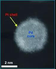 豐田與布魯克海文國家實驗室以及美國能源部合作開發(fā)了具有 Core-Shell 結(jié)構(gòu)的催化劑顆粒。研究人員使用成本更低的 Pd 作為核心,通過電化學(xué)沉積方法在 Pd 核上覆蓋了一層 Pt。經(jīng)過分析,這一 Pt 外殼可以達(dá)到僅有單層原子的厚度。由于 Pt 只是參與催化作用,因此主要只在催化劑顆粒表面起效,因此,在催化劑顆粒的核心用低成本材料替代 Pt,是一種顯著降低 Pt 用量并保持足夠催化劑活性的方法。