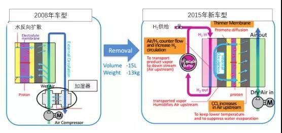 圖 3 所示的是豐田的「自增濕系統(tǒng)」示意圖,這一系統(tǒng)旨在提高水熱管理性能,它是 FCV 商業(yè)化道路上的重要創(chuàng)新。因為它不僅提高了燃料電池系統(tǒng)的耐久性,還降低了成本、提高了動力性能。其工作原理可以解釋為以下四個方面。