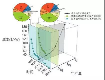 圖 2 展示的是根據(jù)美國能源部建立的成本分析模型,計算出的燃料電池系統(tǒng)制造成本的變化趨勢,以及各個關(guān)鍵組件中的成本分配。這些數(shù)據(jù)使用了基于 80 kW PEM 燃料電池系統(tǒng)的成本模型進(jìn)行計算。圖中,灰色球形符號所在的灰色橫截面,展示的是燃料電池系統(tǒng)制造成本隨年產(chǎn)量的變化。隨著年產(chǎn)量從每年 1k 套增加到每年 500k 套,因為學(xué)習(xí)曲線效應(yīng),成本將顯著降低。每年 1k 套系統(tǒng)基本是當(dāng)前的市場狀態(tài),而預(yù)計當(dāng)燃料電池汽車市場完全發(fā)展時,將可以達(dá)到每年 500k 的產(chǎn)量。另一個維度上,綠色平面和藍(lán)色平面分別對應(yīng)于 100k 和 500k 的年產(chǎn)量時,成本隨著每年的技術(shù)進(jìn)步而降低的趨勢。預(yù)計到 2025 年之后,假如可以達(dá)到 500k 的年產(chǎn)量,那么成本可以降到 40$/kW。餅圖表示了兩種不同年產(chǎn)量對應(yīng)的成本細(xì)分??梢钥吹?,隨著產(chǎn)量的提高,那些制造成本占主導(dǎo)地位的部件,成本比例下降,如 PEM 和 GDL。相反,材料成本占主導(dǎo)地位的部件如催化劑和 BP,它們占總成本的比例增加。