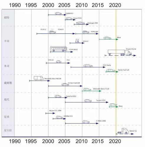 圖 1. 燃料電池概念車、原型車與量產(chǎn)車時間線