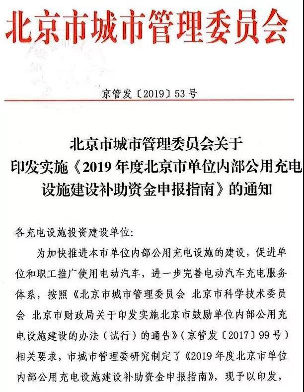 北京市城市管理委員會5月9日發(fā)布《2019年度北京市單位內(nèi)部公用充電設(shè)施建設(shè)補助資金申報指南》。