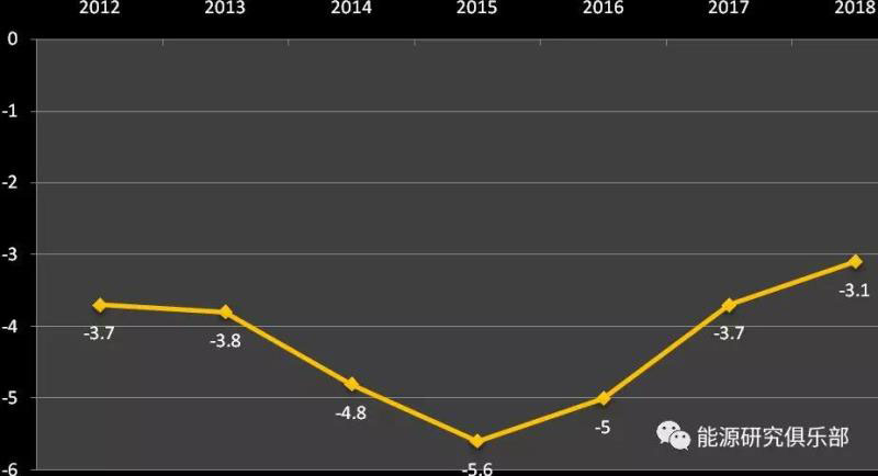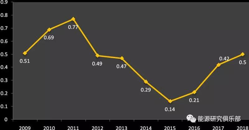 2011年我國能源消費(fèi)彈性系數(shù)為0.77,表明經(jīng)濟(jì)發(fā)展對(duì)能源消費(fèi)的依賴程度較高。2012年和2013年下降到0.5左右,2014年下降到0.29,2015年最終下降到0.14,2016年開始回升,2017年為0.42,2018年為0.5。需要注意經(jīng)濟(jì)增長(zhǎng)與能源消費(fèi)之間的數(shù)據(jù)“背離”。