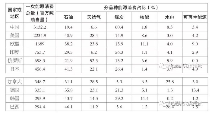 注:數(shù)據(jù)來源于2018年《BP世界能源統(tǒng)計(jì)年鑒》,一次能源包括進(jìn)行商業(yè)交易的燃料,以及用于發(fā)電的現(xiàn)代可再生能源。占比為計(jì)算所得,因與國家統(tǒng)計(jì)局統(tǒng)計(jì)口徑不同,數(shù)據(jù)略有出入