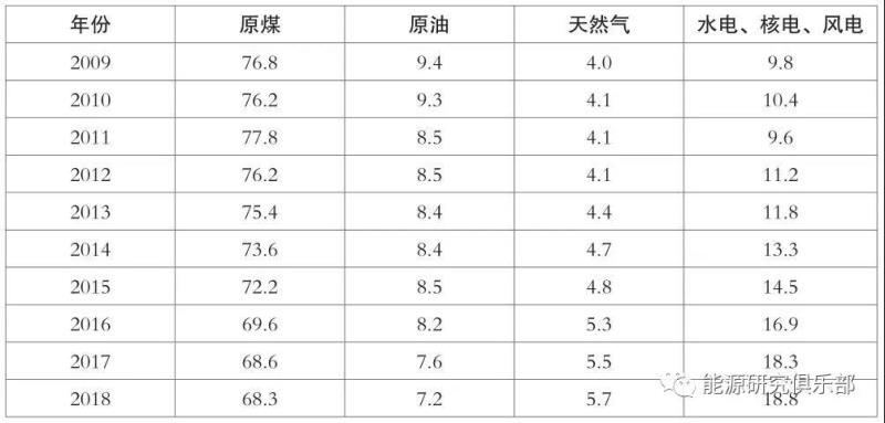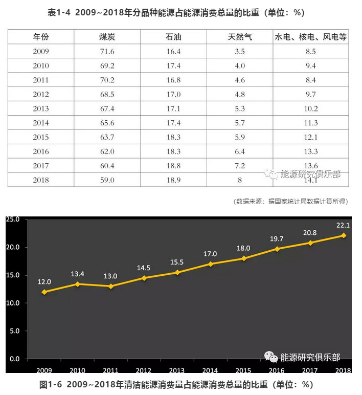 從近十年能源消費(fèi)結(jié)構(gòu)數(shù)據(jù)看,煤炭消費(fèi)占比呈下降趨勢(shì),2018年跌入60%以內(nèi),但短期內(nèi)仍是我國主要能源來源。十年間,清潔能源消費(fèi)占能源消費(fèi)總量的比重從2009年的12%上升到2018年的22.1%,幾乎翻番??傮w看,我國能源構(gòu)成中,煤炭處于主體性地位,石油和天然氣對(duì)外依存度高。清潔能源消費(fèi)占比在持續(xù)提升。