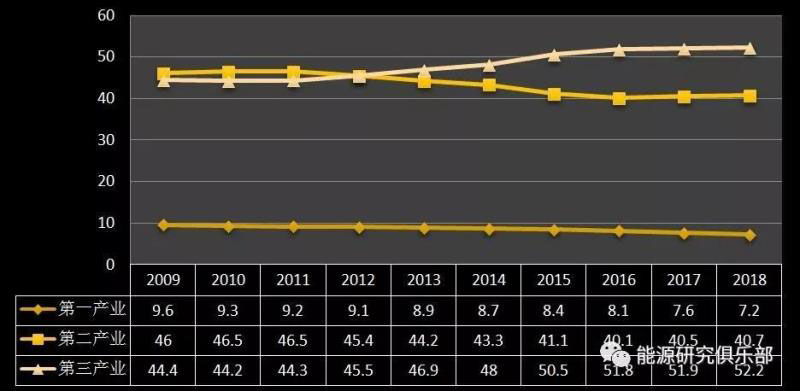 圖1-2?2009~2018年三大產(chǎn)業(yè)增加值占國內(nèi)生產(chǎn)總值比重(單位:%)