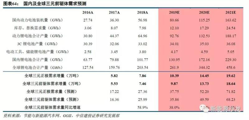 三元正極材料的應(yīng)用主要集中在動(dòng)力電池中的乘用車上,此外還有少部分用于3C消費(fèi)與儲(chǔ)能領(lǐng)域。2014年以來國內(nèi)新能源汽車產(chǎn)銷量的快速增長,帶動(dòng)了車用動(dòng)力電池產(chǎn)量及裝機(jī)量的快速增長,根據(jù)中國汽車工業(yè)協(xié)會(huì)和GGII披露數(shù)據(jù),2018年新能源汽車產(chǎn)量、車用動(dòng)力電池裝機(jī)量增長率分別達(dá)到52%、57%。隨著新能源乘用車產(chǎn)銷量持續(xù)爆發(fā)式高增長,新能源客車產(chǎn)銷量保持平穩(wěn),新能源專用車保持較快增速,我們預(yù)計(jì)2019~2021年國內(nèi)動(dòng)力電池裝機(jī)量增速分別達(dá)到48%、46%、46%。