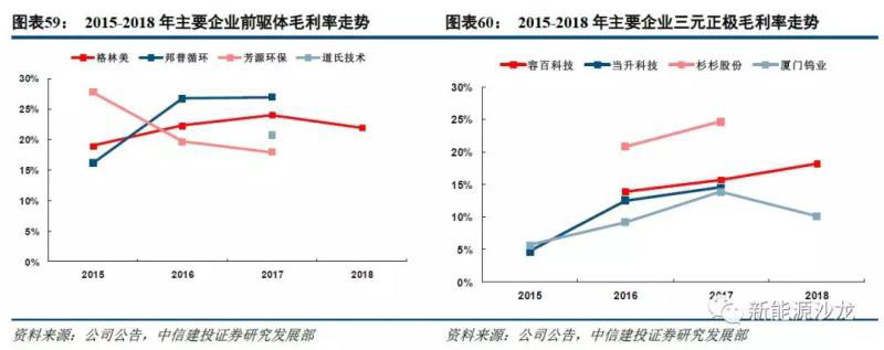 三元前驅(qū)體集中度持續(xù)提升,產(chǎn)業(yè)鏈議價(jià)能力較強(qiáng)。據(jù)統(tǒng)計(jì),2016~2018年國內(nèi)三元前驅(qū)體CR3集中度由37.70%穩(wěn)步上升至46.80%,同期三元正極CR3集中度反而由32.41%小幅下降至30.51%。我們認(rèn)為這也體現(xiàn)出三元前驅(qū)體具有高度定制化特點(diǎn),掌握核心工藝技術(shù)的企業(yè)才能獲得客戶認(rèn)可,導(dǎo)致前驅(qū)體行業(yè)呈現(xiàn)兩極分化特點(diǎn),龍頭企業(yè)產(chǎn)能供不應(yīng)求,集中度不斷提升。而在現(xiàn)有三元正極材料仍以三元5系6系產(chǎn)品為主導(dǎo)的背景下,后道混鋰燒結(jié)工序壁壘相對(duì)較低,導(dǎo)致業(yè)務(wù)同質(zhì)化相對(duì)更強(qiáng),集中度的提升有待811、NCA等高鎳三元正極推廣拉開企業(yè)間技術(shù)差距來實(shí)現(xiàn)。集中度的差異也導(dǎo)致前驅(qū)體企業(yè)議價(jià)能力好于正極企業(yè),目前前驅(qū)體企業(yè)平均毛利率高于正極企業(yè)。