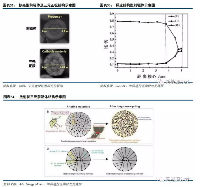 除單晶、高鎳化趨勢(shì)對(duì)前驅(qū)體制備工藝提出的新挑戰(zhàn)外,一些特殊結(jié)構(gòu)前驅(qū)體也在不斷發(fā)展中。比如放射狀生長而成的前驅(qū)體,可制備出放射狀結(jié)構(gòu)正極材料,內(nèi)部可形成由內(nèi)到外的鋰離子擴(kuò)散通道,從而表現(xiàn)出優(yōu)異的倍率性能;比如內(nèi)高比容量、外層高穩(wěn)定性的核殼結(jié)構(gòu)或梯度結(jié)構(gòu),既能發(fā)揮內(nèi)層材料高比容量特點(diǎn),又能提升充電截止電壓和循環(huán)穩(wěn)定性;比如摻雜型前驅(qū)體,通過共沉淀方式將摻雜步驟從后道正極燒結(jié)轉(zhuǎn)移到前道前驅(qū)體合成,相較于火法摻雜,濕法可以獲得更好的摻雜均勻性。