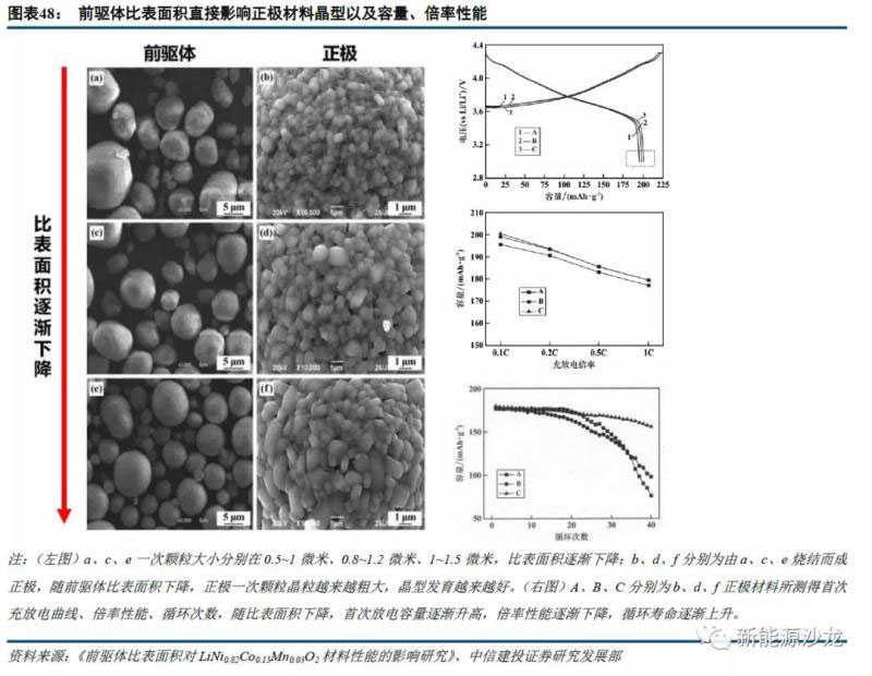 2)前驅(qū)體比表面過大,將導(dǎo)致正極振實(shí)、壓實(shí)密度下降,鋰電池能量密度下降,同時(shí)正極材料與電解液界面反應(yīng)加劇,電池循環(huán)壽命下降;另一方面由于空隙變多,鋰離子傳輸通道變多,電池倍率性能提升。