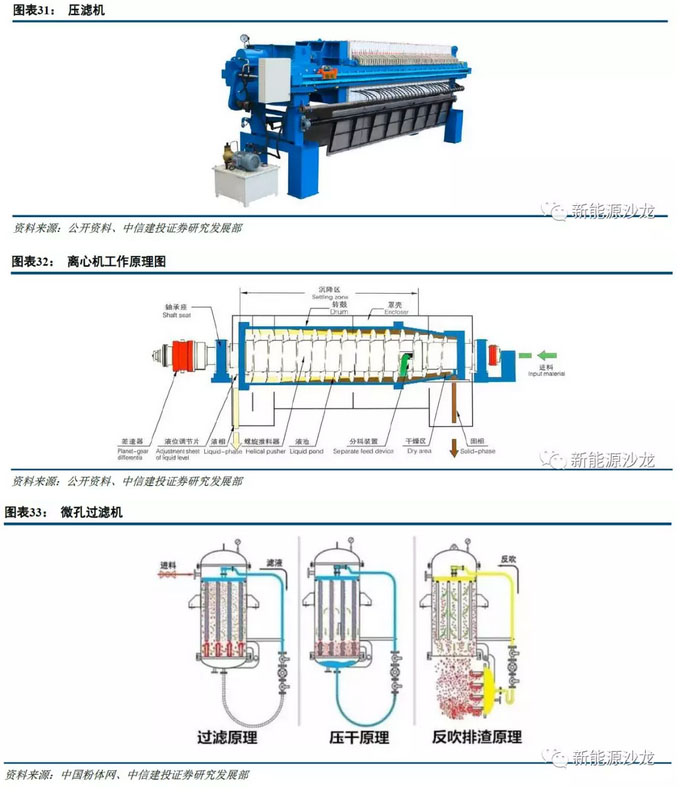 過濾和洗滌設(shè)備:過濾和洗滌作用是將反應(yīng)得到前驅(qū)體漿料實(shí)現(xiàn)固液分離,然后采用洗滌液對(duì)得到前驅(qū)體濾餅進(jìn)行洗滌,去除殘留在濾餅中的硫酸根、氯根、鈉離子等。目前主流廠家均采用過濾洗滌一體化設(shè)備,包括壓濾機(jī)、離心機(jī)、微孔過濾機(jī)、過濾洗滌“二合一”設(shè)備等。